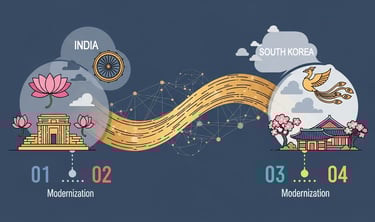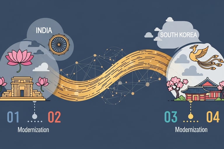 A report detailing the economic journeys of India and South Korea, highlighting the distinct challenges they faced, the strategies they employed for modernization, and the pathways for future collaboration.