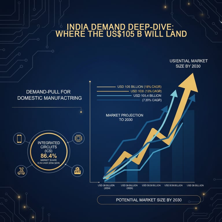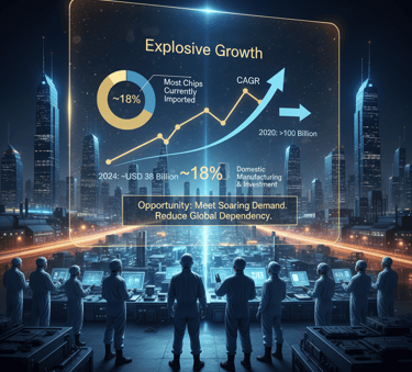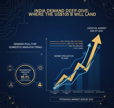 India's semiconductor market is on a trajectory of explosive growth, with forecasts projecting an expansion from as low as USD 38 billion in 2024 to as high as USD 105 billion by 2030, representing a compound annual growth rate (CAGR) of approximately 18%. Other estimates project growth to USD 103.4 billion from a 2024 base of US$ 52 billion. This surge creates a massive domestic capture opportunity, as the country currently imports the vast majority of its chips..