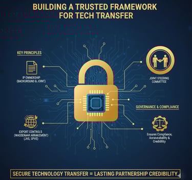Successful technology transfer hinges on a clear and comprehensive governance framework. This includes defining ownership of pre-existing (Background) and jointly created (Foreground) intellectual property. Furthermore, strict compliance with international export control regimes like the Wassenaar Arrangement and national laws is non-negotiable to prevent licensing delays and build trust. A Joint Steering Committee and clear legal structures like JVs or SPVs are essential from the outset.