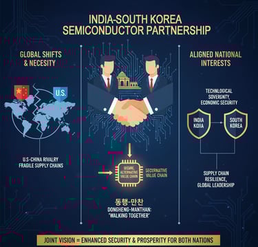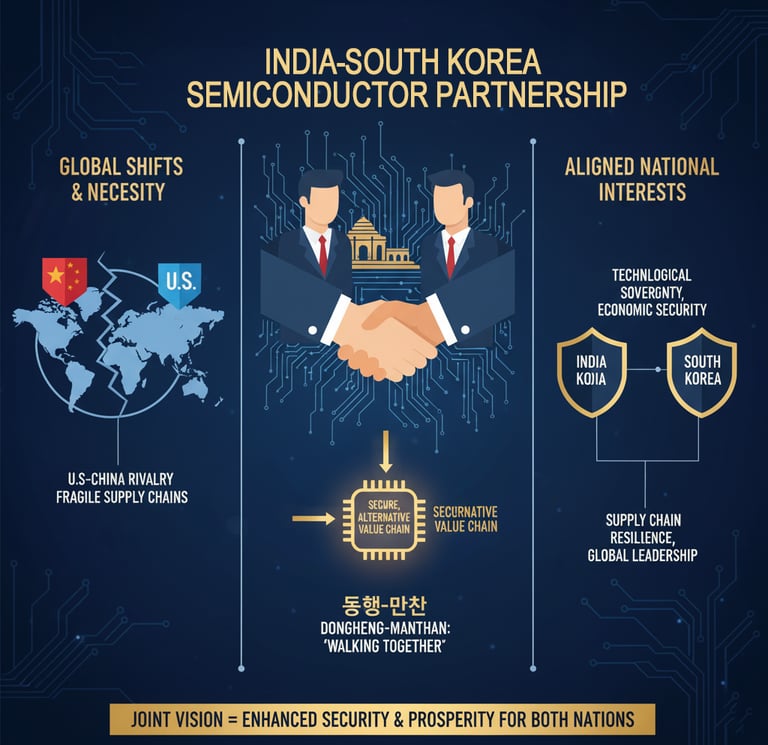 The collaboration between India and South Korea in the semiconductor domain is a strategic imperative, born from a confluence of geopolitical shifts, economic necessity, and perfectly aligned national interests. The intensifying U.S.-China technological rivalry has exposed the fragility of globally concentrated supply chains, creating an urgent need for diversification and resilience. This partnership, rooted in the Donghaeng-Manthan ethos of "walking together," offers a powerful solution by creating a secure, alternative value chain that enhances the technological sovereignty and economic security of both nations.