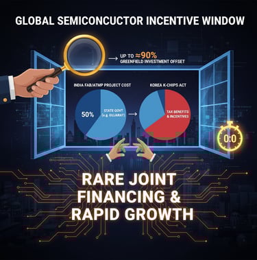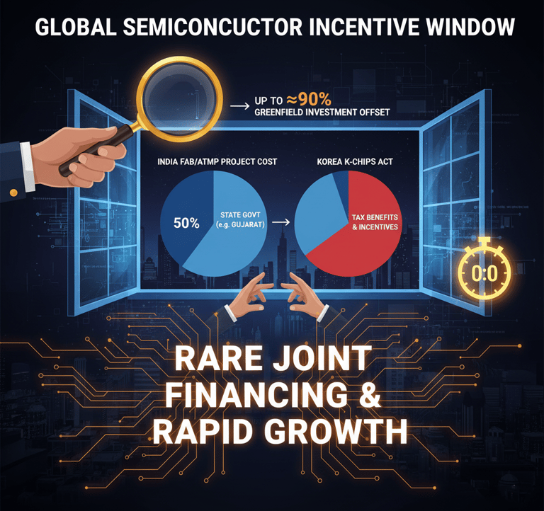 The combination of central and state-level incentives in India creates a uniquely favorable investment climate. India's central government offers a uniform fiscal support of 50% of project costs for fabs and ATMP units. States like Gujarat add up to a 40% capital subsidy on top of this, creating a scenario where nearly 90% of greenfield fab costs can be offset. This, combined with tax credits from Korea's K-Chips Act, presents a limited-time opportunity to lock in highly favorable financing structures.