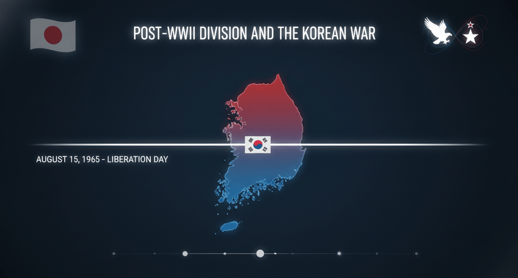 The starting point is August 15, 1945, when Japan officially surrendered, marking the end of WWII. Korea, which had been under Japanese rule, gained its freedom. This date is celebrated as National Liberation Day in both North and South Korea.